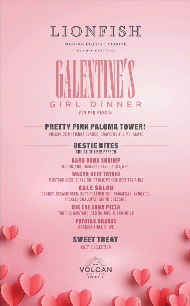 Celebrate the season of friendship at Lionfish with our special Galentine's Girl Dinner! Gather your besties for an unforgettable night featuring our Pretty Pink Paloma Tower, perfect for sharing and snapping Instagram-worthy pics. Indulge in Bestie Bites, a curated selection of our most delicious small plates, and finish with a Sweet Treat, all for just $29 a person!