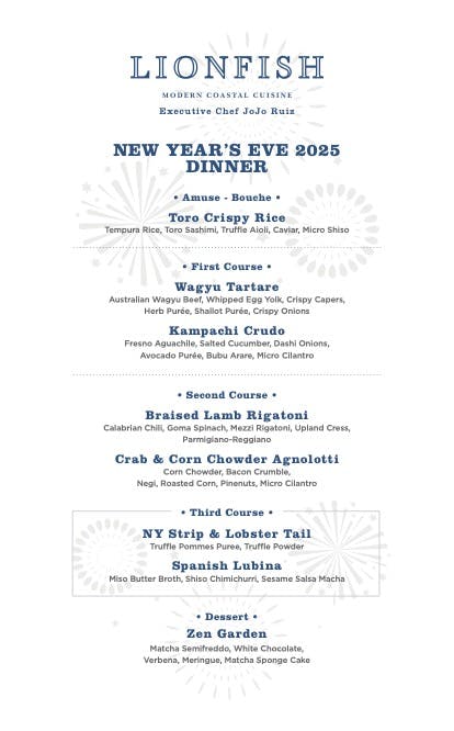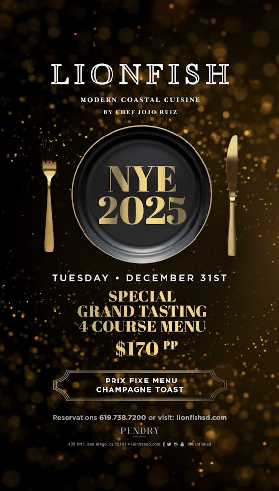 Celebrate New Year’s Eve in style at Lionfish, located in the heart of San Diego’s Gaslamp Quarter. Enjoy a decadent prix-fixe menu for $170 per person, featuring exquisite dishes crafted for the occasion, and toast to the new year with a complimentary glass of champagne. Secure your spot for this unforgettable evening by making your reservation today!